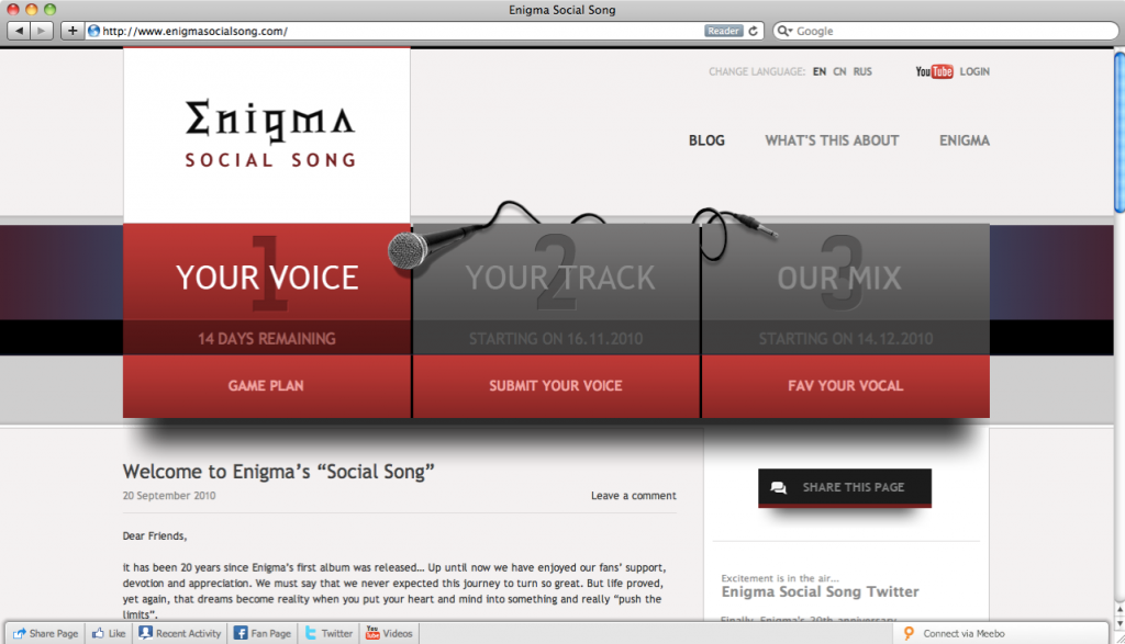 - Stage 3: Our Mix – In the last stage, it’s all about the final mix: Your Vocal. Your Track. Our Mix. “Enigma’s Social Song” will be released and can be downloaded or listened online at the website. The song will be accompanied by a booklet, where every vocal submitter, voter and co-creator of the song that stated his/her will is listed.